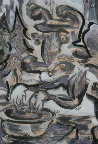 animal behaviour .. acrylic, marker and pencil on wood under plaxi .. 12 x 8" .. $400